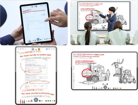 コミュニケーションを活性化する「翻訳サイネージ」の提供を通じて、生産現場における生産性や従業員エンゲージメントの向上に貢献します。また、話した言葉を指でなぞった軌跡上に翻訳して表示することでコミュニケーションを可能にする「しゃべり描き(R)アプリ」や、大画面でのコミュニケーションを可能にする「しゃべり描き電子黒板」などを組み合わせた機能拡充を図り、ソリューションの強化を進めていきます。