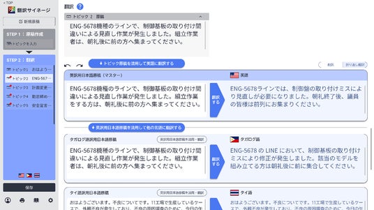 ・英語、ポルトガル語、タガログ語など17言語への翻訳に対応。日本語で事前に作成した原稿を複数の言語に一括翻訳し、朝礼などの集会で、説明者が話すスピードに合わせてサイネージに多言語で同時表示することで、外国籍従業員にそれぞれの母国語で内容を伝達
