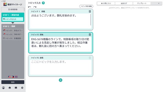 1.日本語で作成した原稿を多言語に一括翻訳し、朝礼などの集会でサイネージに同時表示することで、多様な国籍の従業員にそれぞれの母国語で内容を伝達