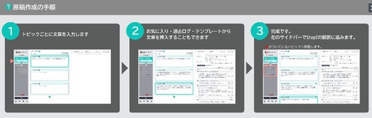 ・原稿作成や翻訳作業を行う画面にガイド画面を追加し、操作の流れを3ステップで簡潔に表示。これにより、操作が分からなくなった場合でも、画面内ですぐに確認が可能