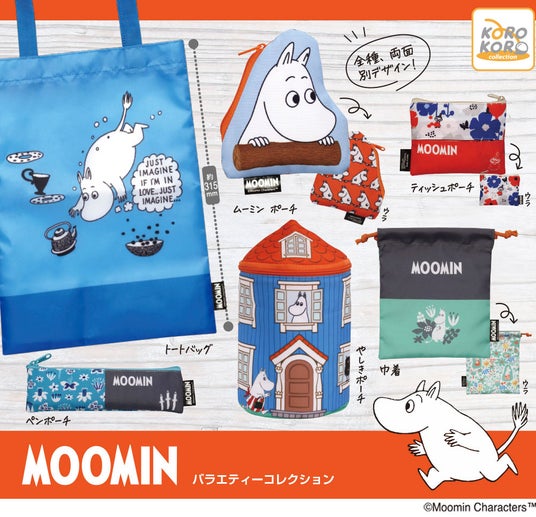 ムーミン一家が暮らすお屋敷の形をした「やしきポーチ」、A4サイズが収納できる「トートバッグ」、ムーミンの可愛いシルエットがデザインされた「ムーミン ポーチ」、ムーミンママたちが隠れている裏面の花柄まで可愛い「巾着」、リトルミイと北欧テキスタイルの相性抜群な「ティッシュポーチ」、ニョロニョロとボタニカルな柄が可愛い「ペンポーチ」とバラエティー豊かなラインナップ。