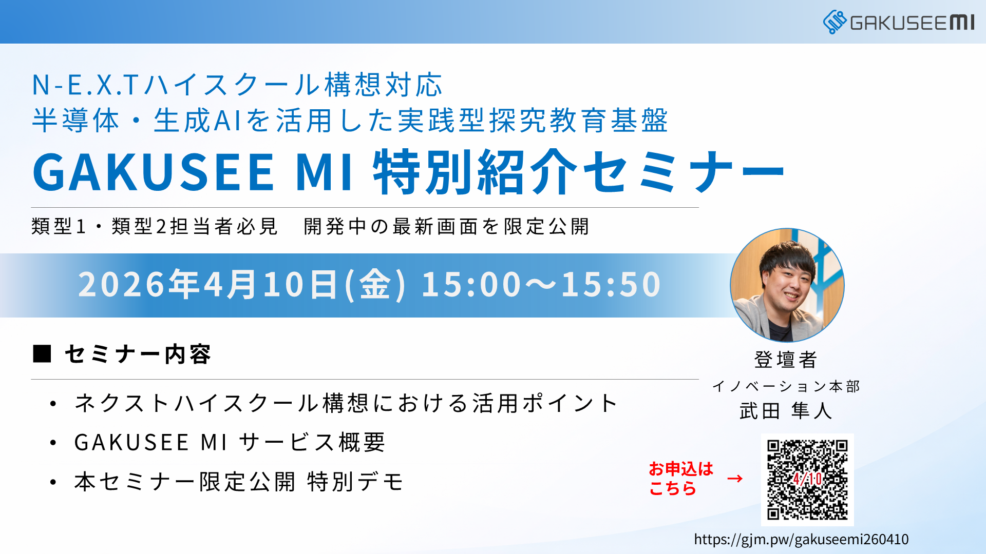 本セミナーでは、文部科学省が推進する「N-E.X.T.(ネクスト)ハイスクール構想」への対応をテーマに、制度要件と教育現場の実情を踏まえながら、「GAKUSEE MI」のサービス概要や活用ポイントを解説。あわせて、実際の操作画面を用いたデモを、本セミナー限定で公開いたします。