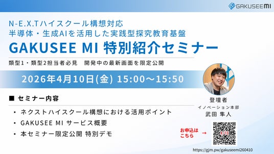 木村情報技術株式会社(本社:佐賀県佐賀市、代表取締役:木村 隆夫、以下「木村情報技術」)は4月10日(金)、半導体と生成AIを活用した実践型探究教育基盤「GAKUSEE MI(ガクシーミー)」の特別紹介セミナーを開催いたします。