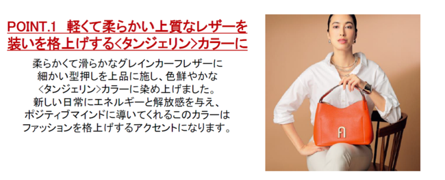 皮革職人の技と上質素材を使用した高品質なアイテムを手に取りやすい価格で90年以上も提供し続けているフルラの企業姿勢と、創業以来女性の毎日に、上質を纏う幸せをお届けしたいというアテニアの想いが共鳴。フルラの新作レザーバッグ「PRIMULA S HOBO」の<タンジェリン>カラーを日本国内で唯一、アテニアが限定販売することが決定しました。