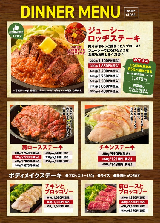 オープン当初からの定番人気「ジューシーステーキ」をはじめ、肉汁がぎゅっと詰まった「肩ロースステーキ」や、低温調理でしっとり仕上げた「国産チキンステーキ」といった人気メニューを取り揃え、“ココロとカラダのチャージスポット”としてさらに進化中です。