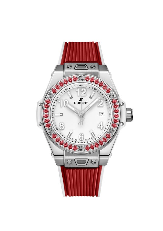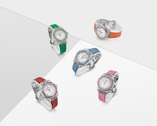 ウブロは、「ビッグ・バン ワンクリック」33mmの新作「ビッグ・バン ワンクリック ジョイフル」を発表しました。5種のカラーストーンと、それに合うカラーストラップを組み合わせた、このシリーズで初めてのモデルです。レッドスピネル、オレンジサファイア、ピンクサファイア、ブルートパーズ、ツァボライトがそれぞれのベゼルに美しくセットされています。