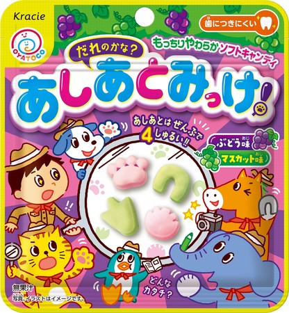 「あしあとみっけ!」は、「ネコ(イヌ)」「ペンギン」「ゾウ」「ウマ」の4種類の足あとの形が入ったソフトキャンディです。クイズ感覚で、どの動物の足あとか当ててみてください。
