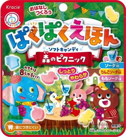 「ぱくぱくえほん」は、「クマ」「ウサギ」「ゾウ」「アヒル」「ぶどう」「りんご」「いえ」「きりかぶ」の8種類の形が入ったソフトキャンディです。絵本の物語を想像しながら、ごっこ遊びをお楽しみいただけます。