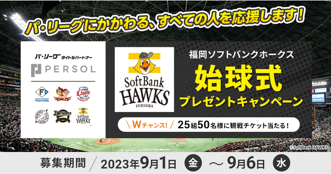 パシフィックリーグマーケティング株式会社(本社:東京都中央区、代表取締役CEO:根岸 友喜)は、2023年度パシフィック・リーグのタイトルパートナーで「はたらいて、笑おう。」をグループビジョンに掲げる総合人材サービスのパーソルホールディングス株式会社(本社:東京都港区、代表取締役社長 CEO:和田 孝雄)とともに、パーソルグループの冠協賛試合「パーソルDAY」の始球式投球権のプレゼントキャンペーンの募集を開始することをご案内いたします。