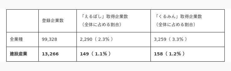 ・「えるぼし」とは、女性活躍推進法に基づいた行動計画を策定し、一定の基準を満たした企業を、女性活躍推進に関する状況などが優良な企業として厚生労働大臣が認定する制度です。厚生労働省 職場情報総合サイト「しょくばらぼ」の登録状況によれば、「えるぼし」の認定企業数は全業種で2.3%、建設業に限定すると1.1%となっています(2023年10月1日時点)。詳細は厚生労働省のウェブサイトまたは「しょくばらぼ」をご確認ください。https://www.mhlw.go.jp/stf/seisakunitsuite/bunya/0000091025.html