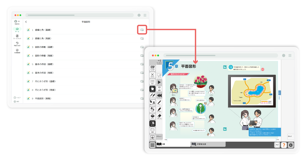 キュビナの問題画面に表示された教科書のアイコンをタップすることで、対応するデジタル教科書の該当ページにジャンプし、教科書で学習することができます。一つひとつの問題だけではなく、問題一覧画面や問題グループのトップ画面からも、デジタル教科書へ連携しています。