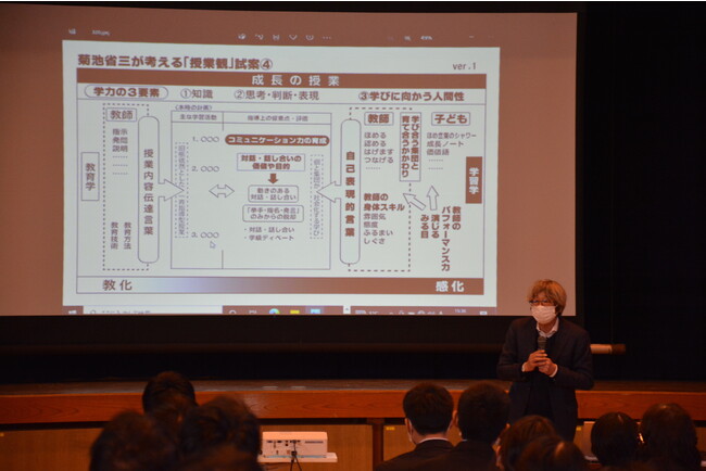 続いて、教員向けに開かれた講演会では、「一人も見捨てない! 菊池学級12か月の言葉かけ」をテーマに教育観を語りました。