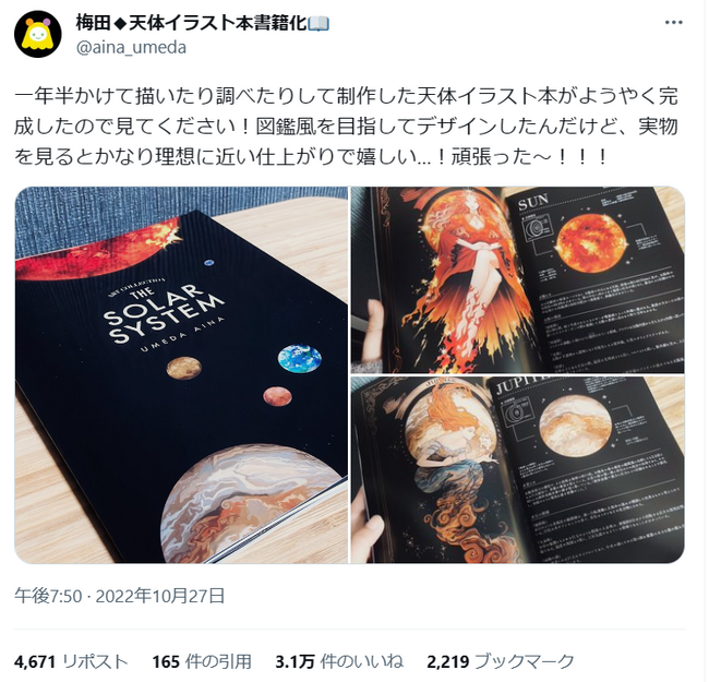 『Celestial Art Exhibition 天体の事典』は天体の基礎知識や雑学を美しい擬人化イラストとともに解説する天体事典です。 2022年10月、イラストレーター・梅田あいなさんが天体や星座を擬人化したイラストをTwitter(現X)に投稿したところ大きな反響があり、それらを収録した同人誌は即完売。その後、増刷が決定するなど話題となりました。