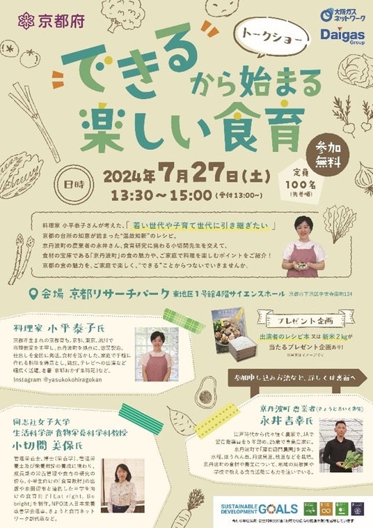 京都リサーチパーク株式会社(代表取締役社長 門脇あつ子、以下、KRP)が主催する「KRPフェス2024」にて、2024年7月27日(土)、京都府・大阪ガスネットワーク株式会社・きょうと食育ネットワークによる「“できる”から始まる楽しい食育『食育トークショー』」が開催されます。