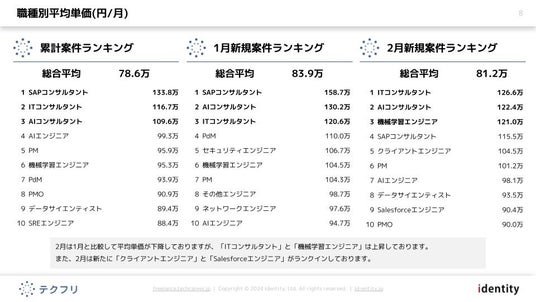 ITフリーランスエンジニアの案件・求人サイト「テクフリ」(https://freelance.techcareer.jp/)を運営する株式会社アイデンティティー(東京都港区、代表取締役:今野 力、以下「当社」)は、テクフリのデータベースをもとに2026年2月における案件の市況感を調査しました。より詳しい結果については、お問い合わせから資料請求が可能です。