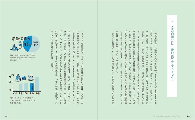 また、プラスチック問題が注目され始める前から、プラ削減に向けてアクションを起こしてきた4つの企業への取材も収録しています。Part3では、使い捨てプラスチックの何が問題なのか? 環境にどのような影響を及ぼしているのか、などプラスチックごみにまつわる基礎知識を、わかりやすくまとめました。