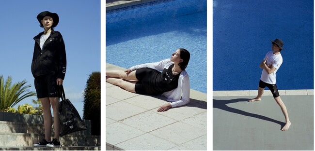 2023年の新作コレクションは、『アニエスベー』創設者アニエス・トゥルブレ氏が好きな“スイミングプールの「ブルー」”をアクセントカラーにしたラインアップが登場します。スイマーに定評のある「アリーナ」の練習用水着を始め、ゴーグルやバッグなどの機能性の高いスイミングアイテムを中心に、UVカット機能(UPF50+)のあるTシャツやパーカー、さらにジュニアアイテムも含め全36型を展開いたします。トップ選手にも認められている『アリーナ』の機能性、動きやすさに加え、両ブランドのロゴをいれたシンプルなデザインを『アニエスベー』のアイコンカラーである黒と白のモノトーンをベースに、アクセントにブルーを効かせたカラーで表現。コラボレーションならではの両ブランドの強みを生かした商品です。