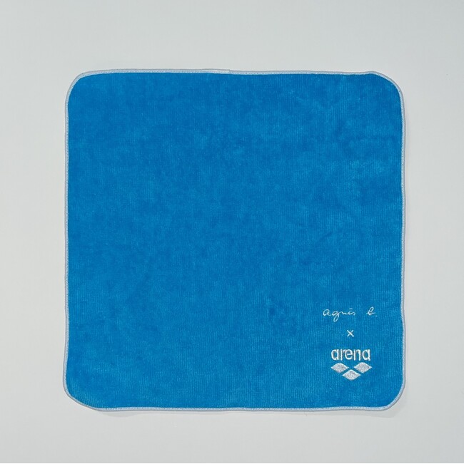 尚、各店舗では予約販売も実施しています。予約販売を含め、税込み11,000円以上ご購入のお客様に先着で『アニエスベー』と『アリーナ』のロゴの入った、今回のコラボレーションのアクセントカラーであるブルーのオリジナルハンドタオル(非売品)をプレゼントするキャンペーンを実施いたします。