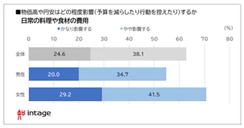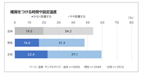 また、日常の暮らしにおける節約意識の高さが伺える結果となりました。「日常の料理や食材の費用」について、7割の女性が「影響を受ける」と答えました(男性は54.7%)。また、「暖房をつける時間や設定温度」については約6割の女性が「影響を受ける」と答えました(男性は47.9%)。いずれも女性が男性に比べて「影響を受ける」と考えています(図5)。