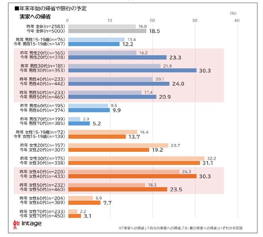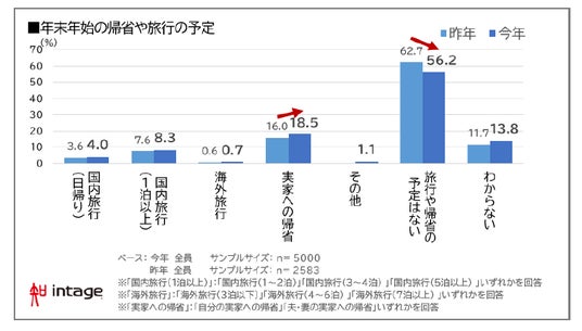 ・ 年末年始の予定は「実家への帰省」が18.5%で最も高く、昨年+2.5ポイント。「海外旅行」は昨年同様少ない