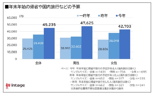 ・ 年末年始の帰省や国内旅行などの平均予算は45,235円。前年比128%と大幅増
