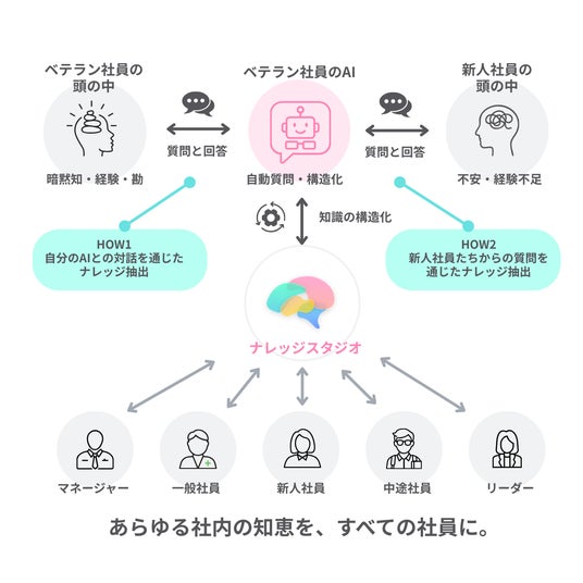 「Knowledge Studio(ベータ版)」は、 暗黙知とオンボーディングの領域に特化した対話型ナレッジプロダクトです。マニュアル整備や事前の文書化を前提とせず、 日々の業務の中で交わされる 「質問と回答」そのものを起点に、 人の中にある判断や経験をAIに反映し、 次の人へと引き継いでいく構造を採用しています。