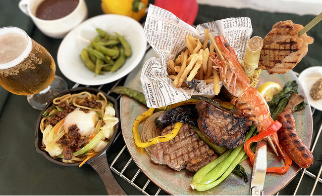 このメニューは、牛ロース肉、チキンの香草焼き、ポークスペアリブといったバラエティー豊かな肉料理をはじめ、海老や野菜も、表面はこんがりと、中はジューシーに焼き上げて、ワンプレートに盛り合わせ、お席までお届けする豪快なバーベキューセットです。また、乾杯用ビールはもちろん、ラー油のピリ辛風味が「アンコール」らしい枝豆や、フライドポテトもセット。そして、「〆のアンコール焼きそば」は、麺に温玉を絡めて、まろやかな味わいをお楽しみください。