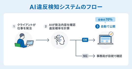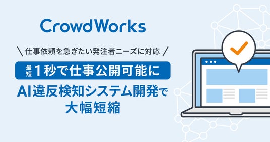 株式会社クラウドワークス(本社:東京都渋谷区 代表取締役社長 兼 CEO:吉田 浩一郎 以下「当社」)は、国内最大級のクラウドソーシング「CrowdWorks.jp」において、新規登録された仕事の利用規約違反を検知するシステム「AI違反検知システム」を開発・導入いたしました。本AIシステム導入により、ユーザーが仕事を登録してから公開するまでの時間が最短1秒、全体平均も1時間未満と、これまでの6分の1に短縮されました。