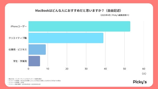 MacBookを「どんな人におすすめしたいか?」という問いには、「iPhoneユーザー」への支持が最も多く、Apple製品間の連携のしやすさが強い魅力になっていることがわかります。