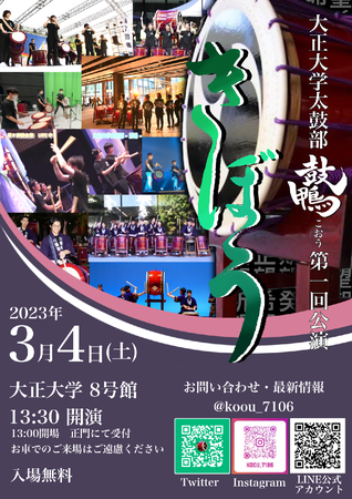 大正大学(学長:高橋秀裕、所在地:東京都豊島区)太鼓部『鼓鴨』は、2023年3月4日(土)13:30より本学8号館にて、創部初の卒業公演「きぼう」を開催します。