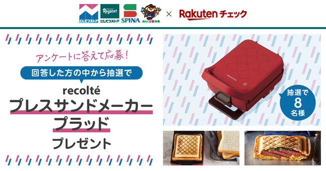 ・キャンペーン内容:キャンペーン期間中に、「楽天チェック」アプリ内のキャンペーンアンケートに回答した方の中から抽選で8名様に、「レコルト プレスサンドメーカー プラッド」を進呈します。
