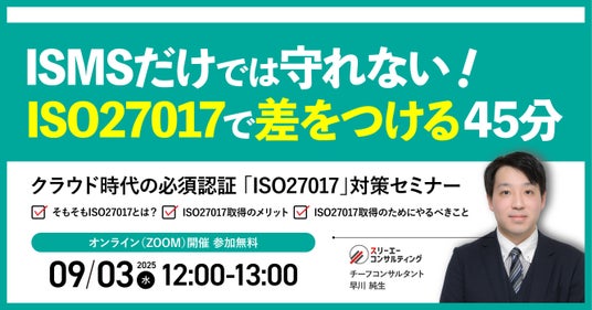 Pマーク、 ISOコンサルにおける支援実績 No.1(注1)のISO/Pマークの取得・運用支援サービス「認証パートナー」を提供する株式会社スリーエーコンサルティング(本社:大阪府大阪市、代表取締役社長:竹嶋 寛人)は、9/3(水)12:00-13:00「クラウド時代の必須認証!ISMSだけでは守れない!ISO27017で差をつける45分|無料オンラインセミナー」を開催します。「そもそもISO27017ってなに?」「ISO27017の取得を考えているけど、何から始めたらいいか分からない…」という方へ向け、基本知識や取得のメリット、取得の流れなどをISO27017のプロが分かりやすく解説いたします。