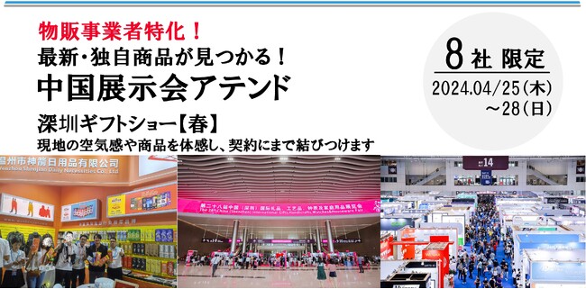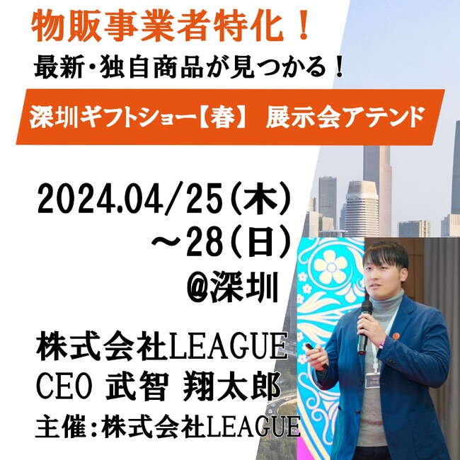 株式会社LEAGUE(本社:東京都武蔵野市)は、今春中国にて開催される「深圳ギフトショー・春」へのアテンドサービスを発表しました。本アテンドサービスは中国からの輸入物販を行いたい個人事業者、メーカー事業者向けに開催されます。