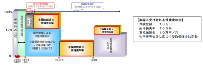 介護休業制度では通算93日までは雇用保険から休業開始時賃金の67%の介護休業給付の支給がありますが、この特約をセットすることによって介護休業給付への上乗せや、介護休業が93日を超える場合の収入の補償が可能となります。