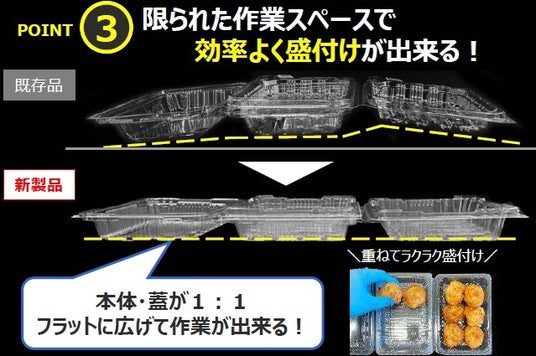 「本体・蓋をフラットに広げて作業が出来る」ように設計されており、重ねてラクラク盛付けができます。これにより、特に狭い場所での作業効率が向上し、作業者の負担軽減にもつながります。