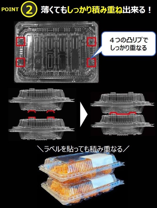「4つの凸リブ」構造により、本体・蓋がしっかりと重なり、安定した積み重ねができます。さらに、ラベルを貼った状態でも問題なく積み重ねが可能で、店舗での陳列や作業準備の際に非常に便利です。