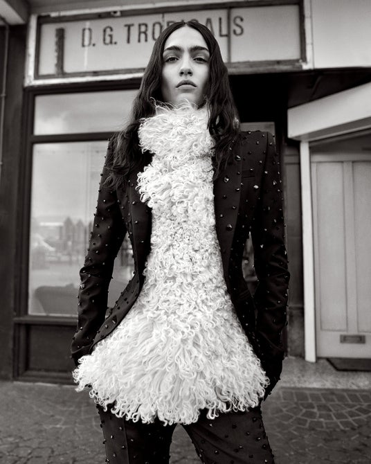 デニムの縫い目や、砕いたジェットストーンがちりばめられたシャープなスーツの胸元からは、動物的な豪華さが溢れ出ています。