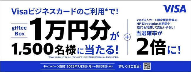 本キャンペーンでは、2023年7月3日(月)から8月31日(木)までの間に、Visaビジネスカードを使ったお支払いが合計10万円(税込)以上の方を対象に、抽選で1,500名様にギフト券1万円分をプレゼントいたします。さらに、期間中に「Visaビジネスオファー」のHP Directplusでのご利用1回以上で、当選確率がアップいたします。