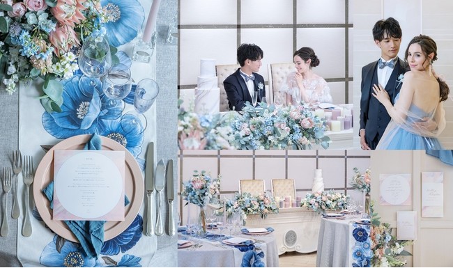 落ち着いた印象のペールブルーに花嫁の頬のようなブラッシュカラーを合わせました。大胆な花柄をクールなカラーでまとめ、甘すぎない大人なウェディングを表現します。