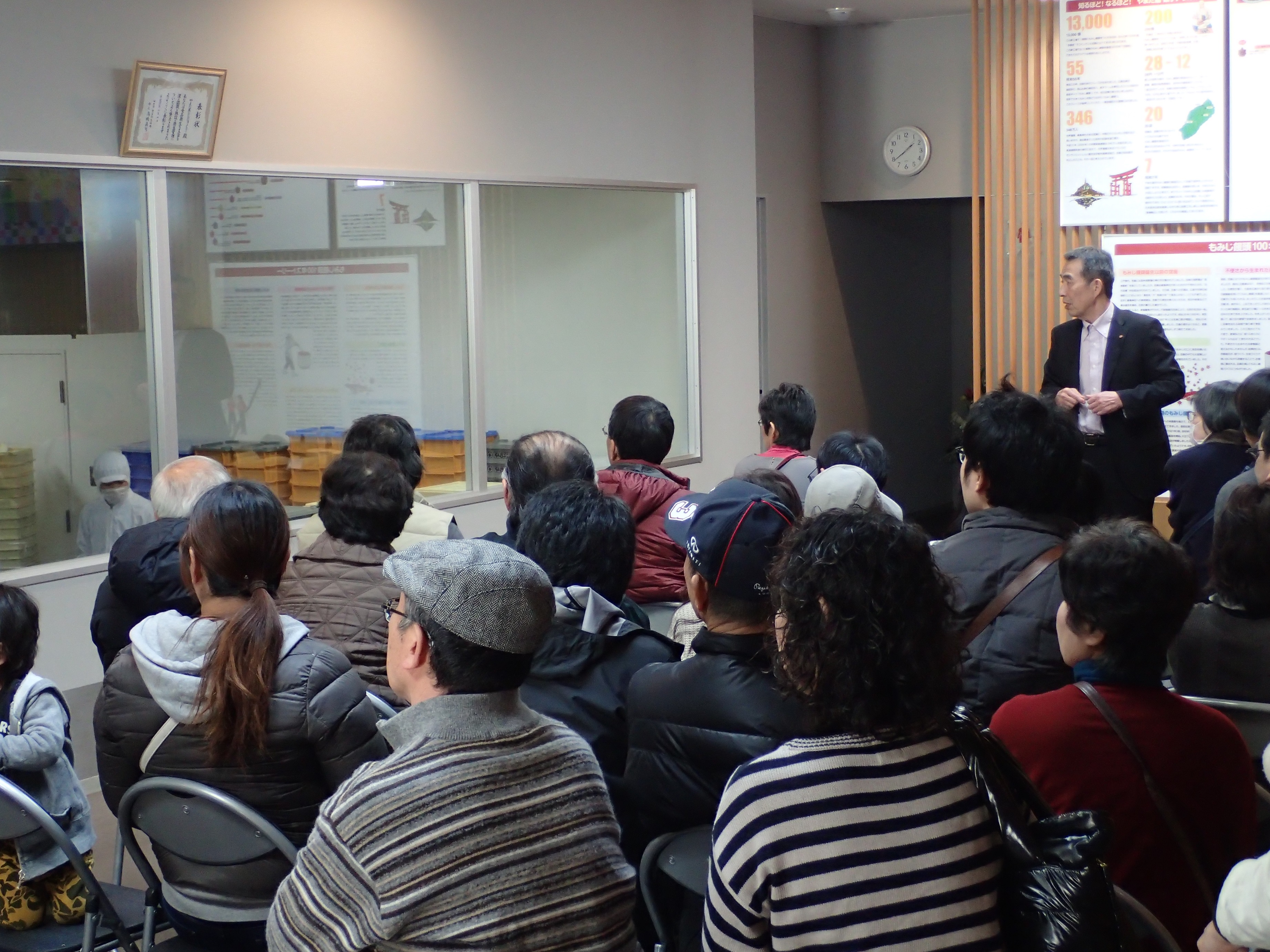 当日は「やまだ屋 おおのファクトリー」(廿日市市沖塩屋)に於いて、およそ2.5倍の倍率から抽選で選ばれた皆さんが、午前と午後の2回(各回70名)に分かれ、「もみじ饅頭」誕生の歴史から今の製造までを、担当者の説明を聞きながら見学していただきました。