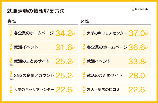 就職活動で役に立った情報源は「各企業のホームページ」が男女ともに1位