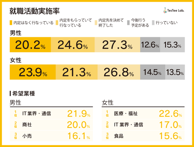 続けて、「就職活動を行なっている(内定保持者含む)、今後行う予定がある」と回答した人を対象に希望の業種を尋ねたところ、男性の第1位は21.9%で「IT業界・通信」、第2位は20.0%で「商社」、女性の第1位は22.6%で「医療・福祉」、第2位は17.0%で「IT業界・通信」となりました。