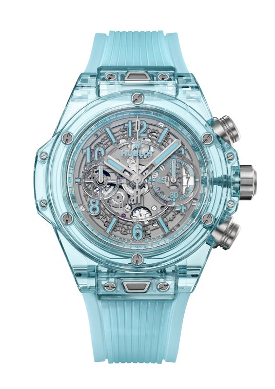 ウォーターブルーサファイアクリスタルは、ウブロのR&D部門が開発した最新素材です。44mm径のケースとベゼルは、トランスルーセントなブルーラバーストラップ、そしてオープンワークダイアル上のインデックス、針にあしらわれたブルーのアクセントとよく調和しています。
