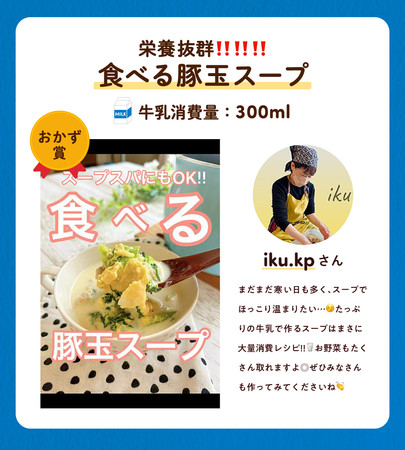たっぷりの牛乳とふわふわたまごの豚玉スープです。調味料は、コンソメと塩だけでとってもシンプル。だからこそ牛乳のおいしさをしっかり味わうことができます。ご家庭でも簡単に作ることができるこちらのレシピがおかず賞に選ばれました。