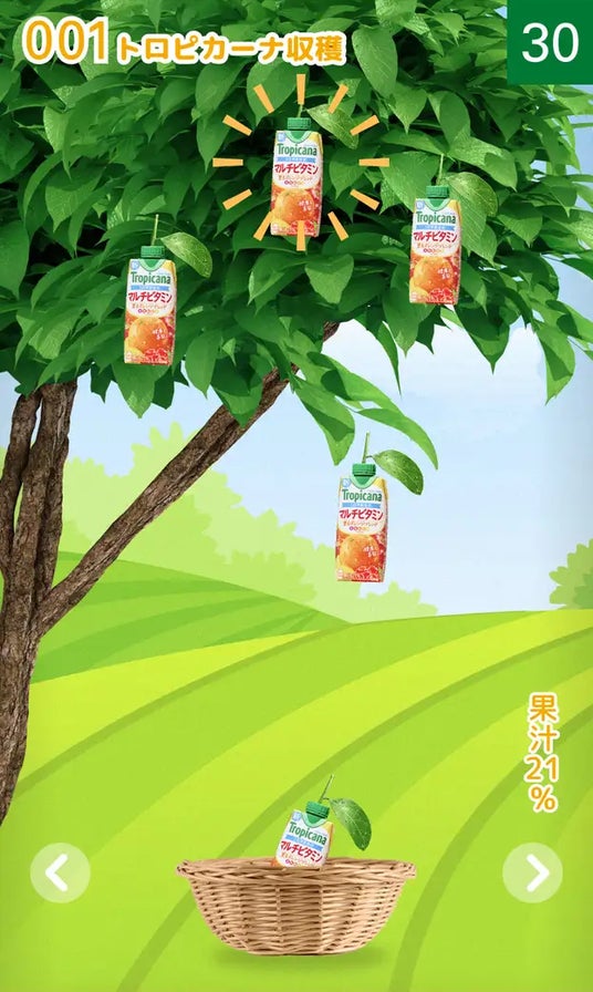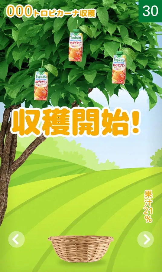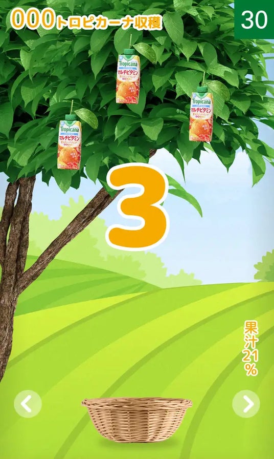 - かごの横にある矢印を長押しで左右に移動して、落ちてくるトロピカーナをキャッチ。