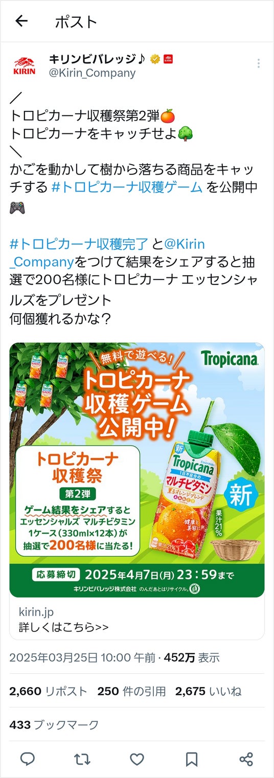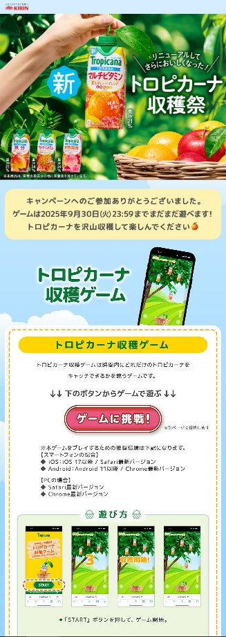 第2弾では、制限時間内にどれだけ多くのトロピカーナをキャッチできるかを競う「トロピカーナ収穫ゲーム」を展開。ゲーム終了後に「#トロピカーナ収穫完了」と「@Kirin_Company」をつけて結果をX上でシェアすることで、抽選で200名様に「トロピカーナ エッセンシャルズ」が当たる仕組みとなっています。