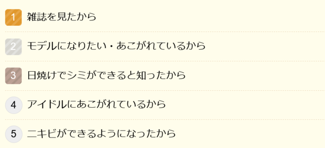 「雑誌を見たから」が最多でした。2位以下には、芸能人への憧れや、シミ・肌荒れの予防のためといった意見も集まりました。