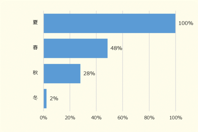 「夏」がトップで100%でした。次いで「春」、「秋」となりました。