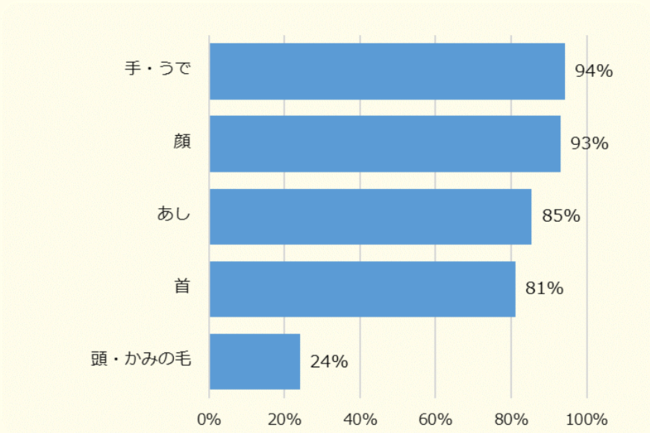 最も多かったのは「手・腕」、次いで「顔」「足」となりました。