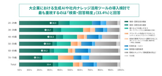 また回答精度、セキュリティに次いで重視する「使いやすさ」も14.6%と高く、特に、実際に活用する若手世代(20代、30代)では「使いやすさ」を求める割合が高い傾向があります。